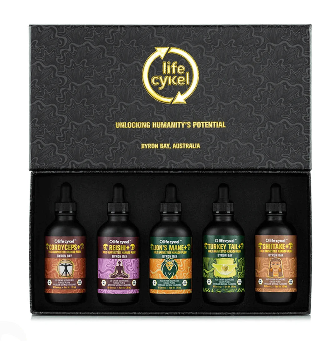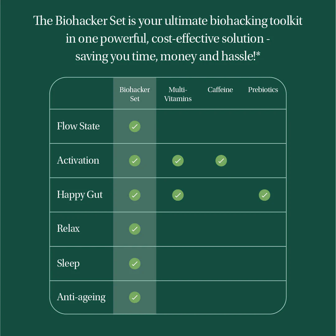 The Professional Biohacker Set™ is a curated collection of advanced functional mushroom extracts crafted for high performers seeking to upgrade their body and mind. Featuring Lion’s Mane, Cordyceps, Reishi, and Chaga, this set delivers a synergistic blend to support cognitive function, endurance, stress adaptation, and cellular health.