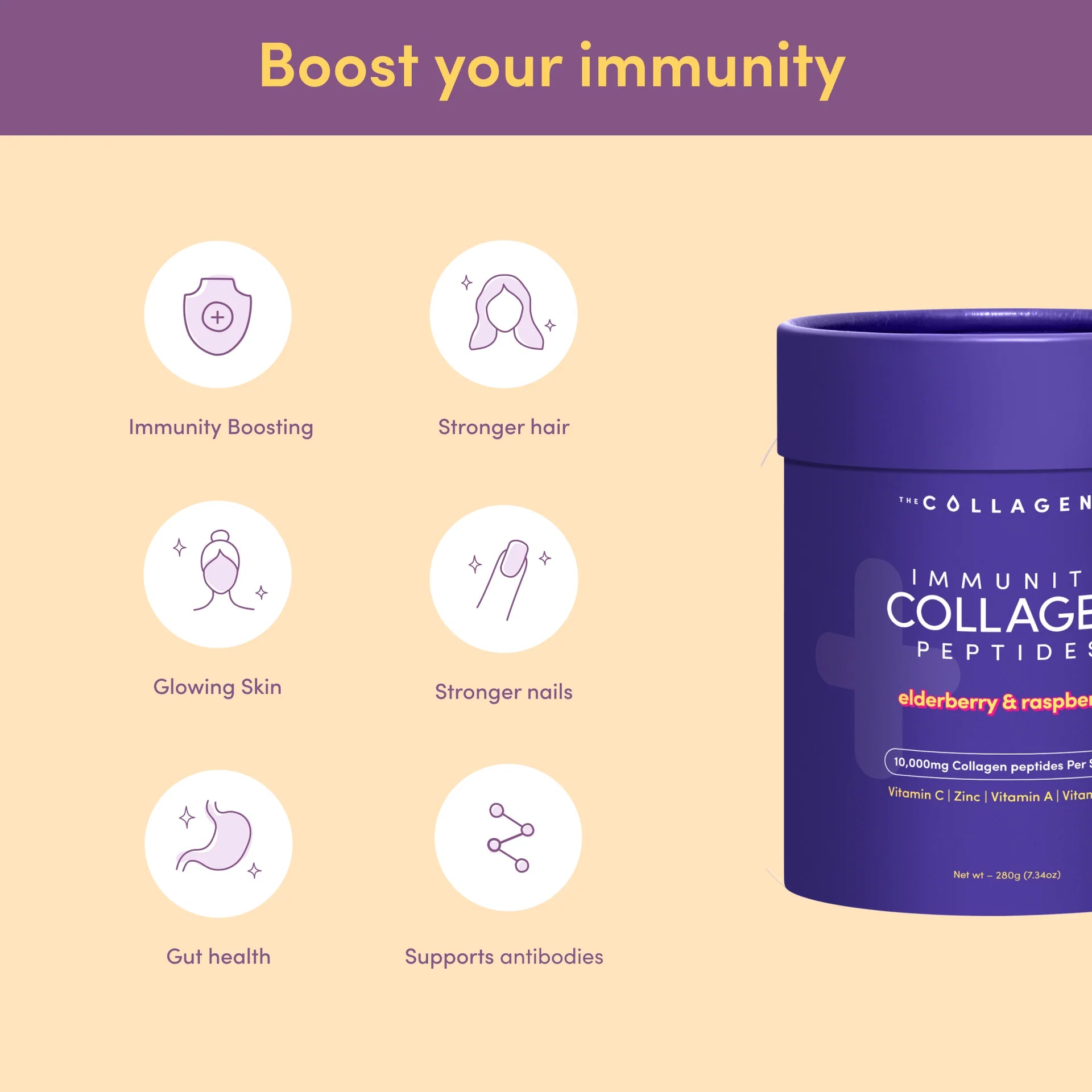 Immunity Collagen combines premium hydrolysed collagen peptides with vitamin C, zinc, and functional superfoods to support both skin health and immune defence. This dual-action formula nourishes your body’s structural proteins while fortifying its natural defences — so you can look radiant and stay resilient year-round.