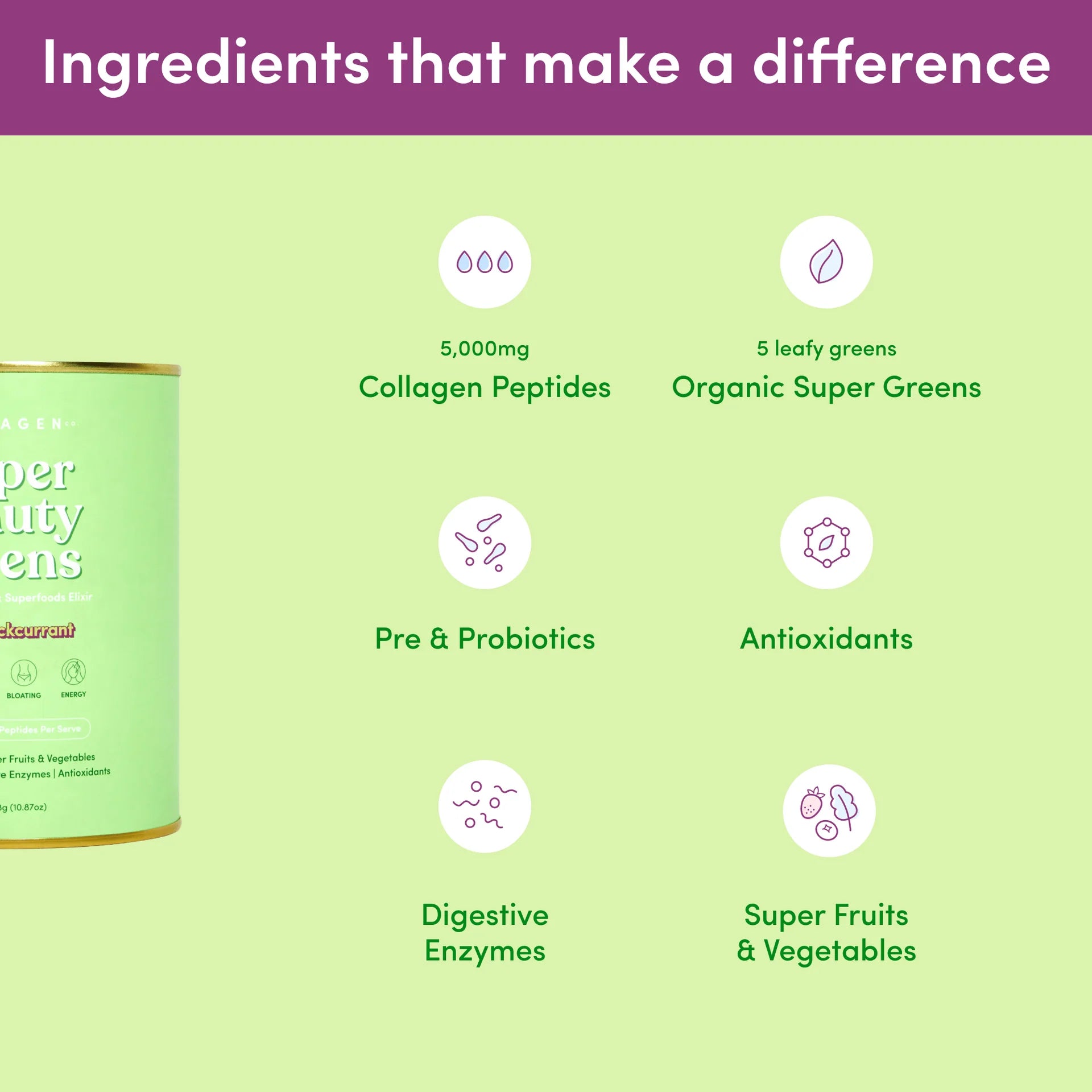 Super Beauty Greens is a nutrient-packed blend of hydrolysed collagen peptides, alkalising greens, antioxidants, and probiotics — designed to support skin radiance, digestive health, and daily vitality. With over 30 wholefood ingredients, it’s a beauty-focused greens powder that goes far beyond basic detox.